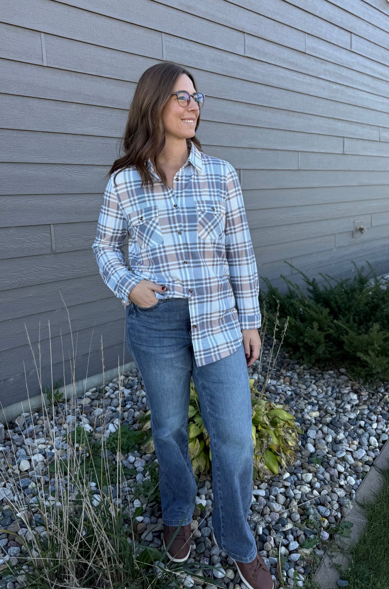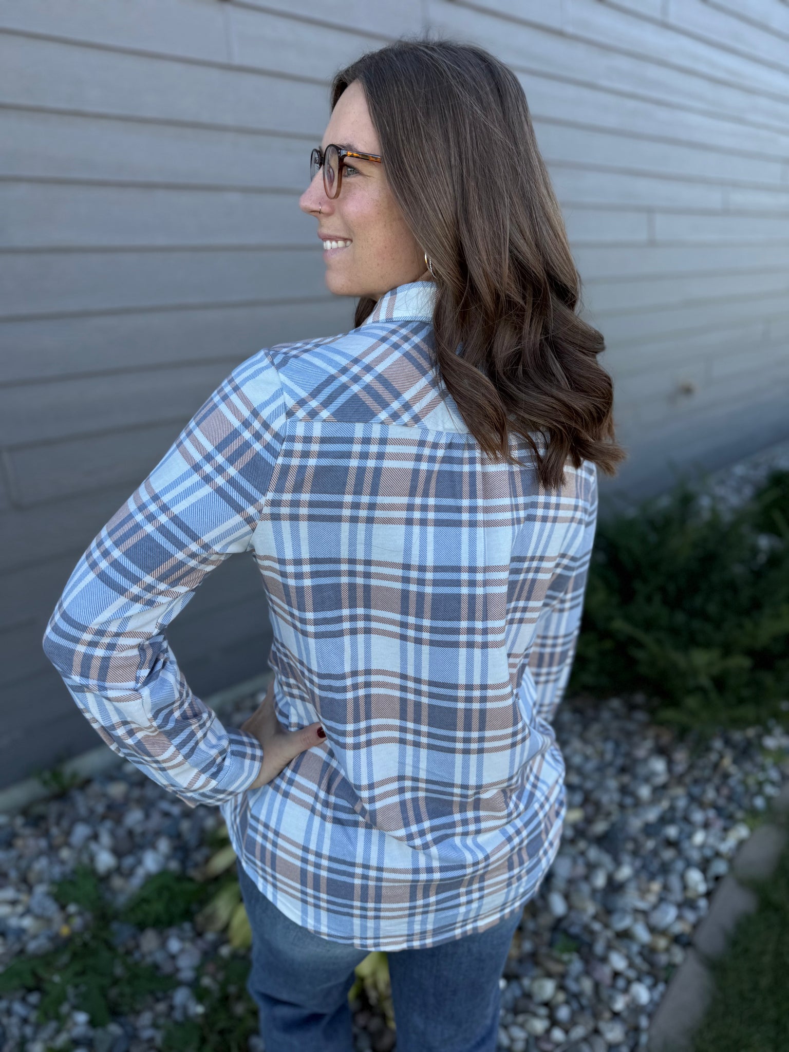 Add a timeless staple to your wardrobe with this soft plaid button-up in muted blue and neutral tones. Designed with a relaxed fit, button front, and dual chest pockets for a classic, versatile look. Perfect for layering over a tee or pairing with denim for a comfortable everyday style.