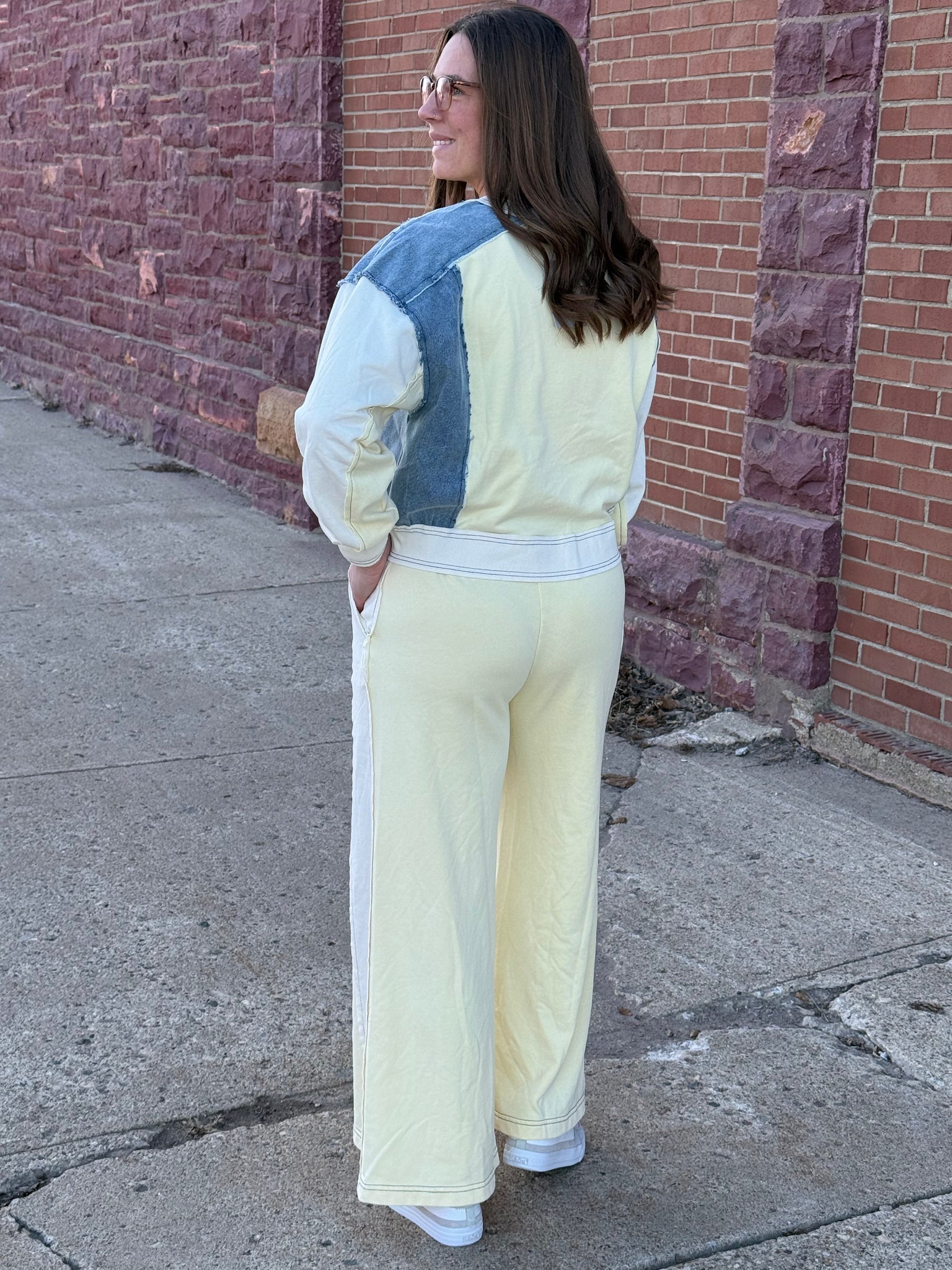 Elevate your everyday style with this colorblock cropped sweatshirt, featuring soft cream contrasted by vertical light-wash denim panels for a modern, laid-back vibe. Designed with a relaxed fit, ribbed cuffs and hem, and subtle raw-edge detailing for an effortlessly cool finish. Perfect for pairing with high-waisted jeans or the matching pants for a casual-chic look.