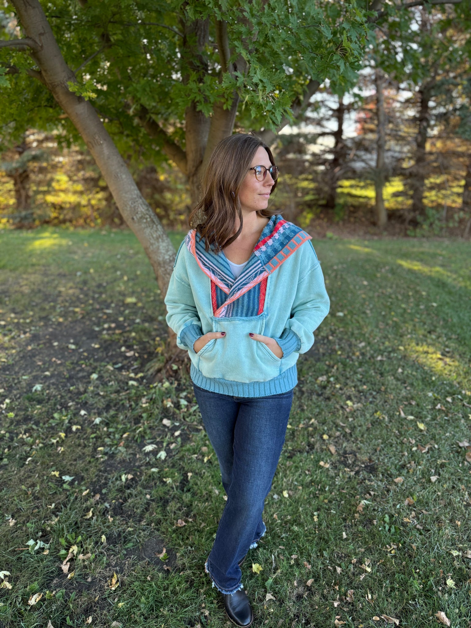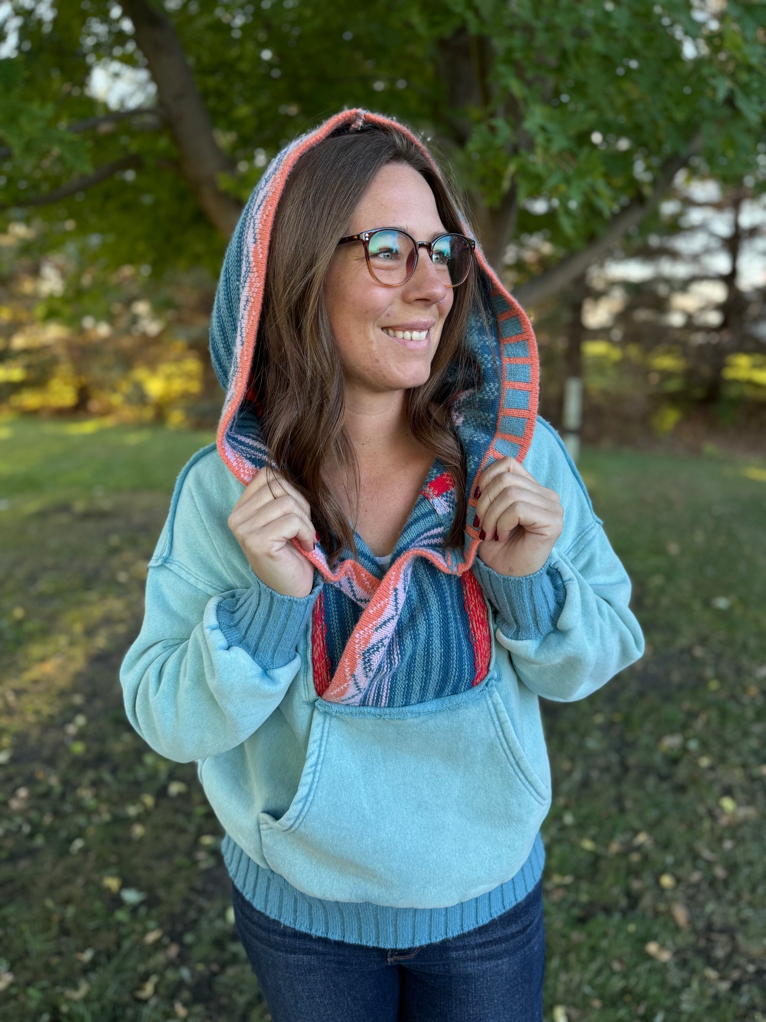 Stay cozy and stylish in this soft cropped hoodie featuring a unique multicolor woven hood for a pop of personality. Designed with a relaxed fit, ribbed cuffs, and a front kangaroo pocket for everyday comfort. A fun and comfortable piece that adds a little extra character to your causal wardrobe.