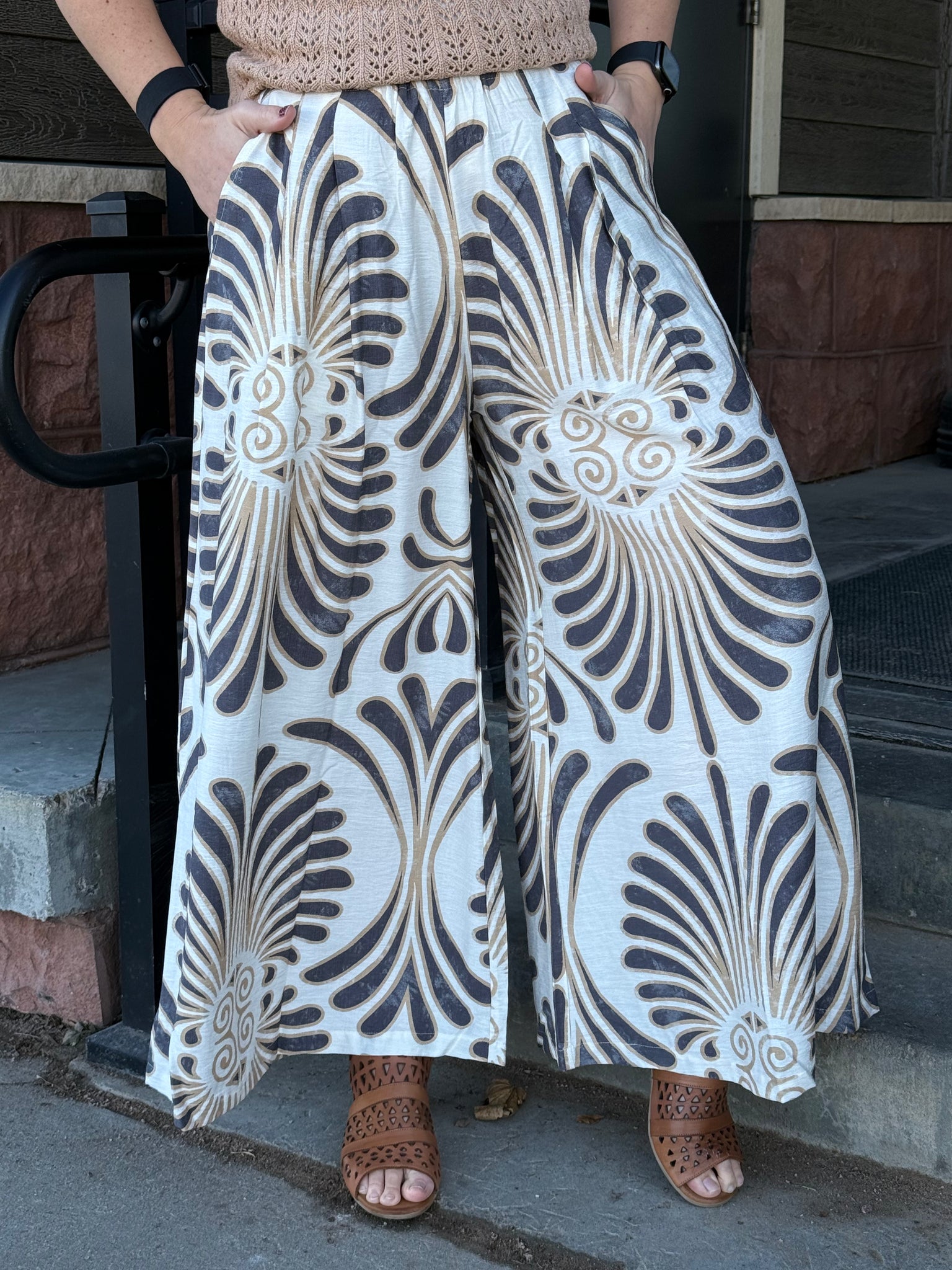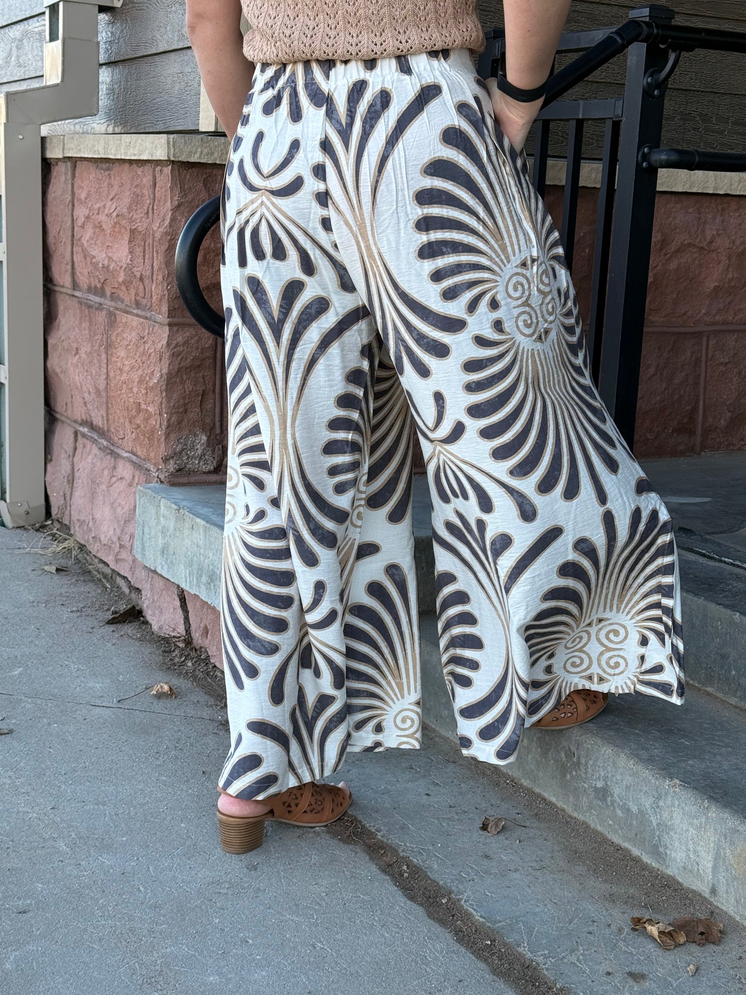 Make a statement in these bold printed wide-leg pants, featuring an eye-catching neutral-toned swirl pattern for a modern, artistic vibe. Designed with a flowy silhouette and comfortable elastic waistband for an easy, flattering fit. Pair them with the Taupe Sweater, simple tank, or blouse to let the print take center stage.