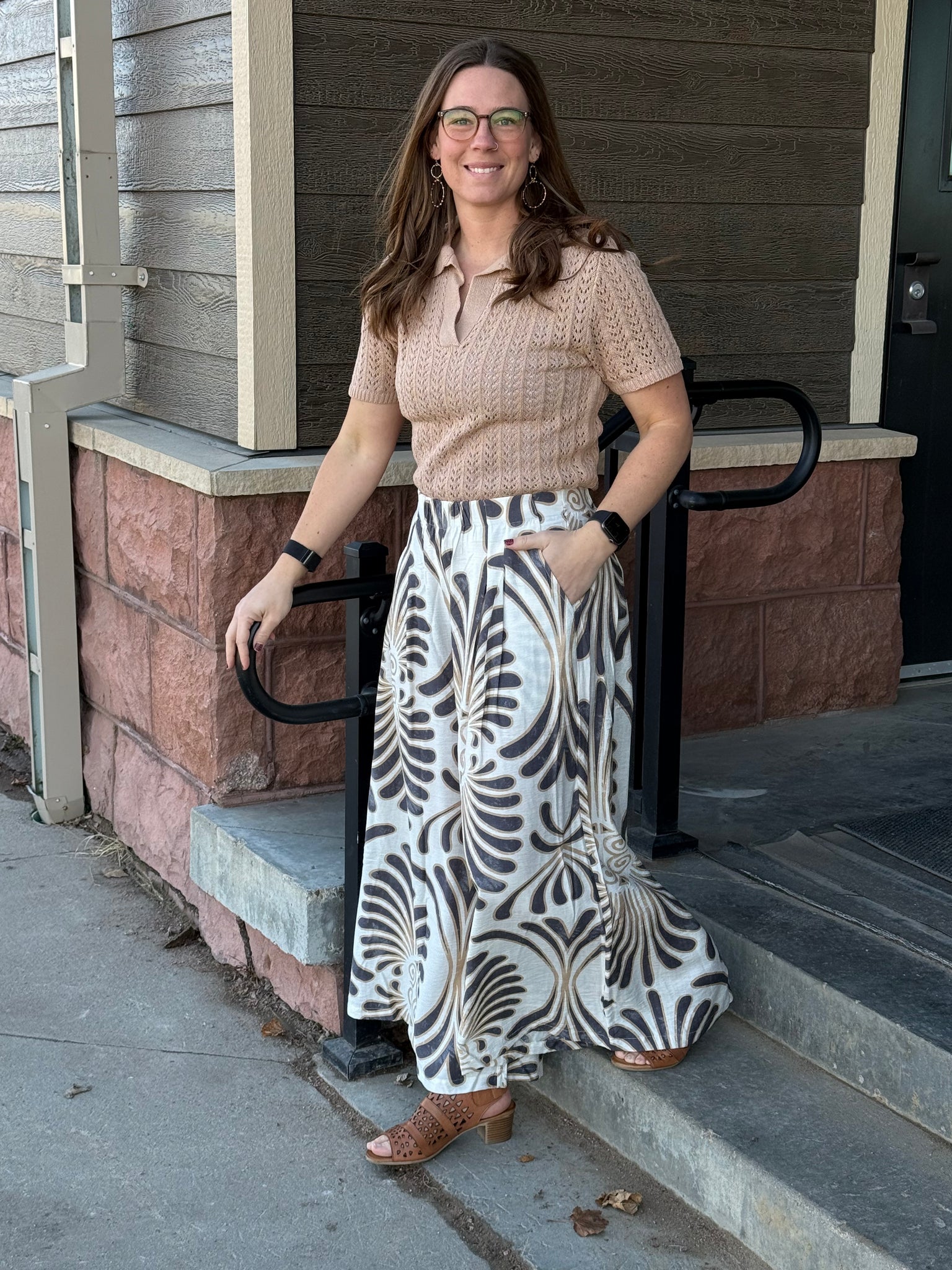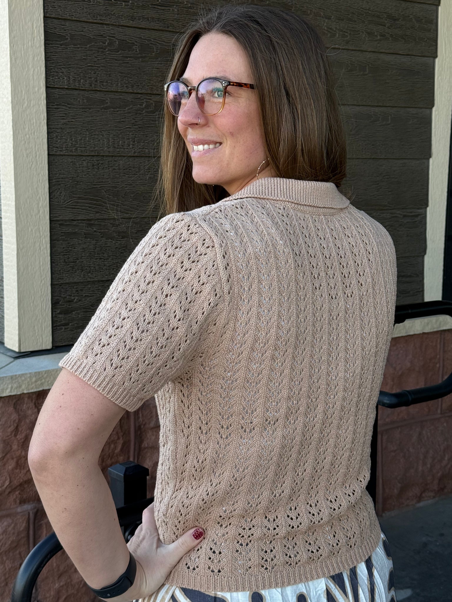 Add a touch of easygoing charm to your wardrobe with this short sleeve knit polo sweater in a soft taupe hue. Designed with a delicate pointelle pattern, classic collar, and relaxed fit for a breathable yet polished look. Perfect for pairing with denim, trousers, or skirt for an easy everyday outfit.