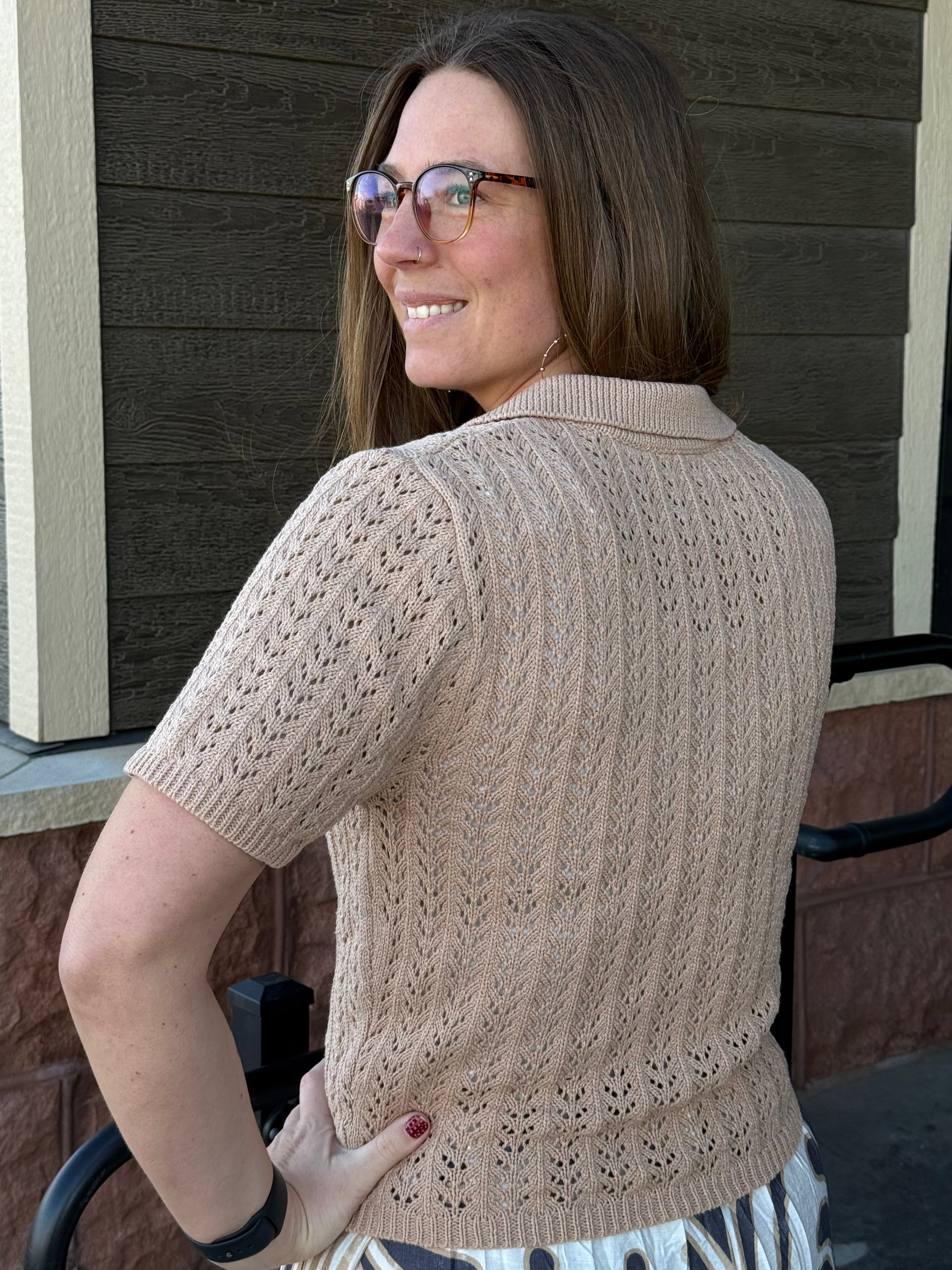 Elevate your daily rotation with this breathable taupe pointelle knit polo. Featuring a timeless collar and relaxed fit, it seamlessly blends sophisticated polish with effortless, everyday comfort.